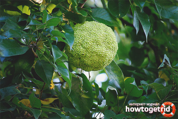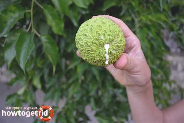- In complex therapy, an adam apple can be used for inflammation of hemorrhoids, high blood pressure. In addition, the internal intake of potions based on the fruits of maclura allows you to destroy harmful microorganisms and increase the body's defenses. For the preparation of medicines, both fruits and fresh leaves and tree branches are used. Large and ripened fruits should be chosen. Their color is yellowish.
