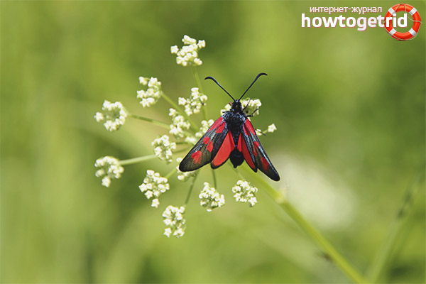 - Meadowsweet motley. This species has the greatest distribution. The front wings are black.A slight metallic sheen is characteristic. Large spots with bright red color are located on the wings. The butterfly caterpillar is small in size with a dense body that is covered by hairs. The caterpillar is able to accumulate cyanides. If one of the animals swallows it, then it can simply be poisoned.