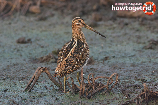 Snipe is well recognized. It can be easily identified by its long, narrow and sharp beak. In the structure of the anatomical structure, the beak is the most noticeable element. Often its length is one third of the whole body. Short paws emphasize the asymmetry of the body. It is very difficult for a simple layman to distinguish a female from a male. Only an experienced ornithologist can do this.