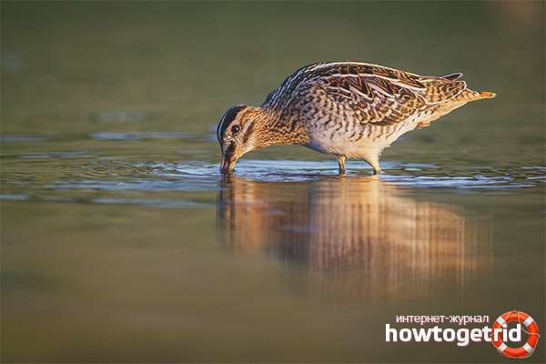 For its nutrition, snipe uses small insects, bugs, flies, spiders, their larvae. It feeds on plant seeds only in exceptional cases.Her hunt is very unusual. To catch an insect the bird sticks its sharp beak into the ground. The victim is swallowed by a snipe right in the ground, without taking its beak out.