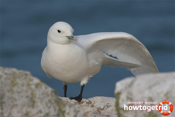 They fly very fast, and can also run on the surface of the earth. White plumage makes them invisible against the background of snow and the northern sky. They feed on fish thrown ashore, because they do not know how to dive. Unpretentious to food. They can eat lemmings, invertebrates, and even chicks of other birds. In the summer they eat the waste of whaling. In winter, polar bears can follow to eat the remnants of their food. Sometimes after a storm on the shore there remains a huge number of cows, which birds feed on plenty.