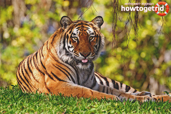 The tiger also practices this method of hunting, when it tries to silently get to the animal at a distance of 10 m and jump on it, trying to immediately clutch its throat. In this, the dissected appearance of the color helps him a lot, helping to successfully mask in the thickets.