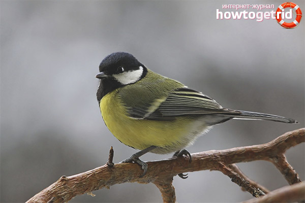 The average size of the great tit reaches 15 centimeters. A bird weighs about 20 grams. She can spread her wings by an average of 23 centimeters. Great tit is very beautiful. On her breast is a black strip, like a tie, which divides the abdomen into two halves of a lemon color. The back is shimmering in olive color, and the wings and tail are gray. The natural outfit complements the black beret on the crown, which is in good harmony with the white cheeks of the bird.