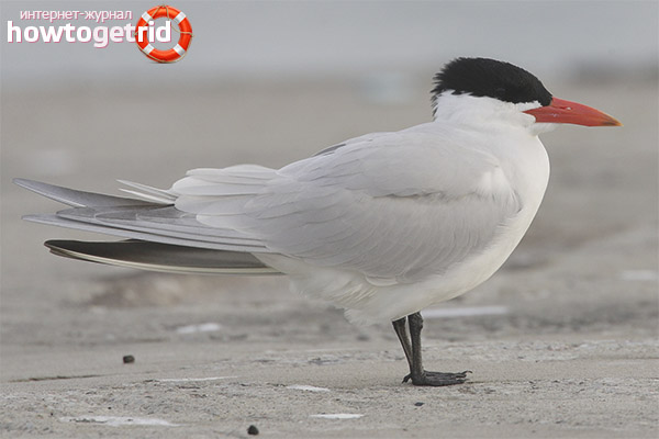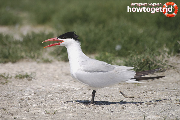 This species of terns, like tegrava, is the largest of the family of these birds, only slightly inferior in size to a silver gull. Chegrava differs from this species of birds with a characteristic hat that has a rich dark color, of the same color with its paws, a bright red beak and a tail ending in a neckline.