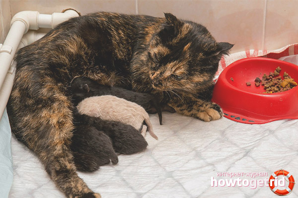 When the birth itself begins, the cat during this time not only consumes a sufficiently large amount of energy, but also loses a decent amount of fluid. At this time, she needs to provide free access to a sufficient amount of fluid. The cat must drink a lot. If necessary, a bowl of water is brought directly to its muzzle. Liquid is especially necessary for the cat after it licks the kitten. This will contribute to the production of milk.