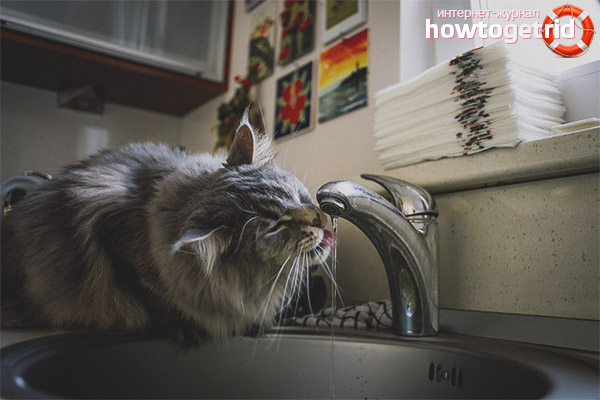 Domestic cats, like their wild counterparts, consume relatively little water, but you should always monitor its presence and freshness in a bowl. This is especially important if dry cat food is present in the cat's diet. Any household filters are suitable for cleaning water from excess hardness salts and chlorine. The use of boiled water worsens the condition of the teeth due to the low content of carbonates and bicarbonates.Signs of a lack of water appear in cats in the form of concentrated urine, the appearance in the discharge of crystals, which leads to the development of urolithiasis.
