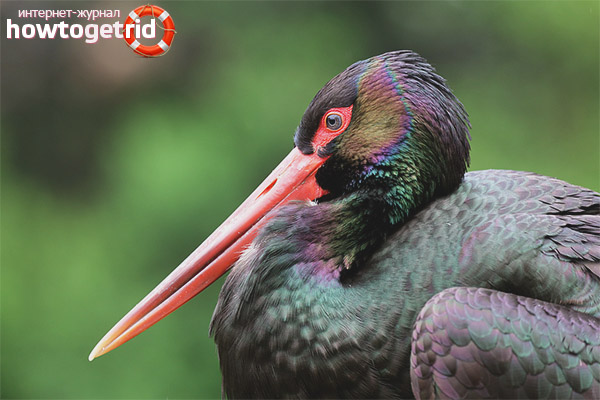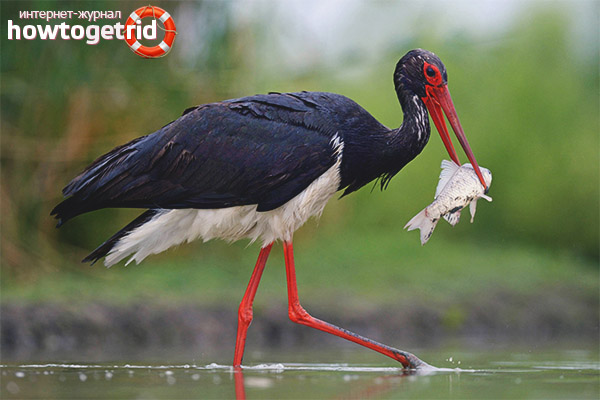 The black and white stork is listed in the Red Book. Body length is 105-110 cm, wingspan - 215-220 cm, weight - up to 3.5 kg. The tail length is moderate; the end is slightly rounded. The black-and-white stork is covered with black feathers with violet-green, reddish or metallic shimmer, has white breasts and a belly. It resembles a dress coat dressed on a white shirt from the side. Feet and places not covered in feathers are red. The beak is long, 2 times longer than the head, with a sharp end. It has a dark color, only in chicks and adults at the time of mating, it acquires a red color.