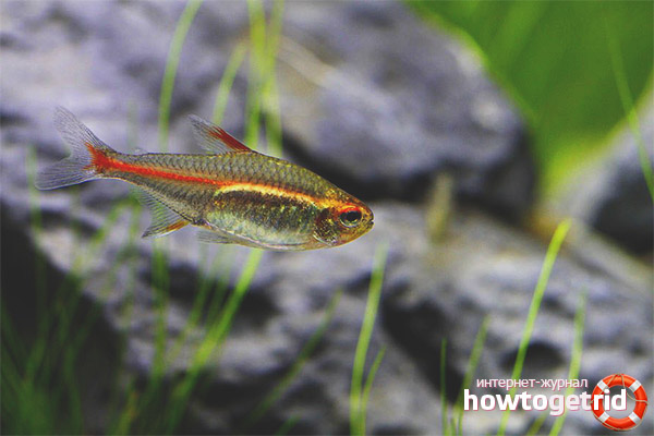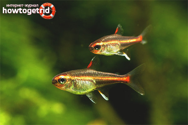 - These fish are transparent, on the body along the lateral parts there is a horizontal strip. It goes from the head to the caudal fin. The strip is red-orange, in young animals it is weakly expressed, but in sexually mature individuals it is clearly visible. If the correct lighting is provided in the aquarium, then the erythrosonuses will glow like neons.