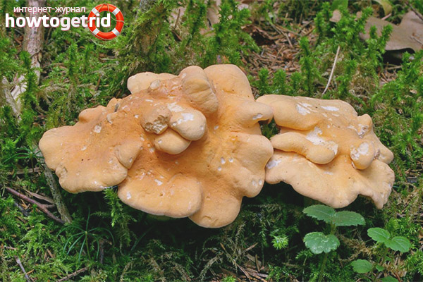 Outwardly resembles an ordinary chanterelle. The hat is dense, fleshy, with a diameter of 3 to 13 cm, under favorable growth conditions it can reach 16 cm. The irregularly shaped surface is dry, strewn with small tubercles, when touched by hand it feels like velvety. While the mushroom is young, the hat is convex, its edges are turned down. But with age, it becomes smoother, the edges become wavy. Hats usually grow together near mushrooms. The color palette varies in yellow shades - from yellow-pink to orange. The older the mushroom, the darker the hat. Neither the young nor the old blackberries can clean the hat from the skin - it does not separate.