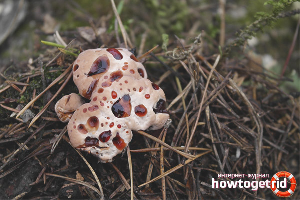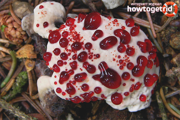 - We proceed directly to the description of the mushroom itself. It is whitish with a slight pink tint. The hat is velvety, has an interesting format with armholes and bends. On the hollows, some points are observed, similar to drops of a red tint. The fluid exits through the pores. These drops in some categories of individuals are associated with bloody traces. Over time, a kind of growths similar to teeth form on the edges of the fungus. It is due to this feature that the mushroom was called a bleeding tooth.