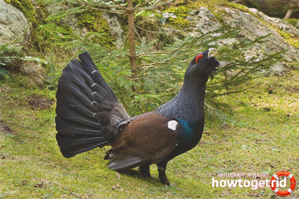 The plumage of the capercaillie also differs by sex. The male has black feathers on the head, front of the neck, as well as on the tail interspersed with white spots. The back of the neck is more grayish in color, and his body is black with brownish and grayish spots. Goiter and breast of the bird has a greenish tint. Brown plumage predominates on the wings more often. Above the eyes of the bird is a patch of bare skin with a reddish hue.
