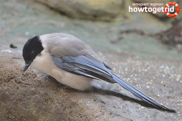 It is easy to recognize the blue magpie among related species by the characteristic long tail of a stepped form and the general coloring of a pleasant bluish color, as well as the black cap decorating its small head. As a rule, forty small colonies nest; the bird is very careful. Magpies of this species are distinguished by a rather loud, from afar audible voice.