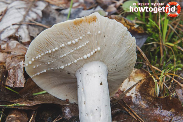 - The plates may be forked. They are painted at the edges in whitish color, and closer to the core they become beige. Fall to the ground. Spore powder is pigmented with a whitish tint. The base itself is compacted and light, white. The leg narrows to the beginning, reaches a height of 8 cm. With a diameter of 4 cm. There are wrinkles on the base.