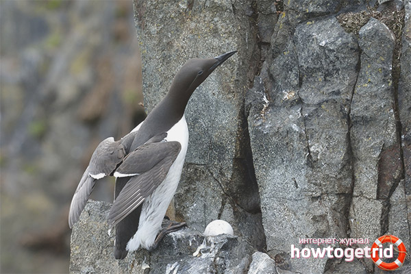 Guillemots fly to nesting sites in late April and early May, choosing rocky shores for hatching. As such, the birds do not have a nest - the masonry takes place directly into the recess of stones. The guillemots lay one pear-shaped egg each. This form protects the egg from falling, because it has no other points of contact. An elongated and pointed egg can twist around its axis, but is unlikely to fall down the rocks. The color of the egg can be white, gray and even blue, each clutch is different in its pattern of inclusions and a hint of shell. Each egg is unique and parents easily recognize it among the rest of the offspring.