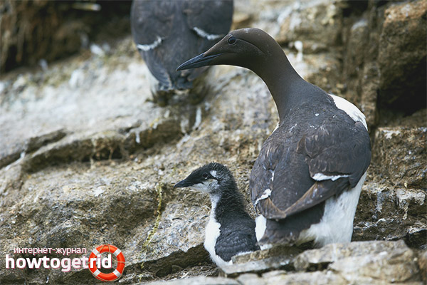 The guillemot's nesting site becomes permanent for her. Upon reaching the age of two, maturity sets in, males and females pick a mate. In a relationship, the guillemots are monogamous - they remain faithful to their partner for life. Throughout life they nest in one place, flying there again and again every year. The duration of the egg hatching is about a month. If a chick or an egg dies at some stage, the female can lay another clutch, up to three times per season. A month after the chick hatches, parents stimulate the kids to go down into the water, they teach them how to fish and escape from enemies. Together with their parents, the guillemots go on their first wintering.