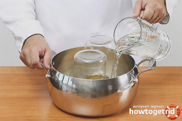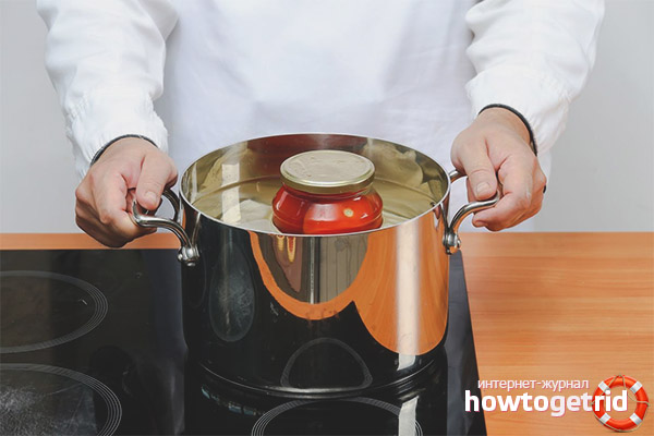 Some prescription recipes indicate that sterilization of cans should be carried out along with the contents. Such processing is usually used in the preservation of vegetables, salads, mushrooms, etc. At the same time, pour water into the pan, taking into account the height of the cans. The fluid should reach the narrowing section of the containers.
