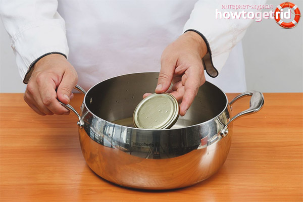 The pan should be large and deep so that it can fit as many cans as possible. Containers with components should not be immersed in boiling liquid, but in hot, with a temperature of not more than 60 degrees. Cans should be covered with lids for the entire heat treatment period.