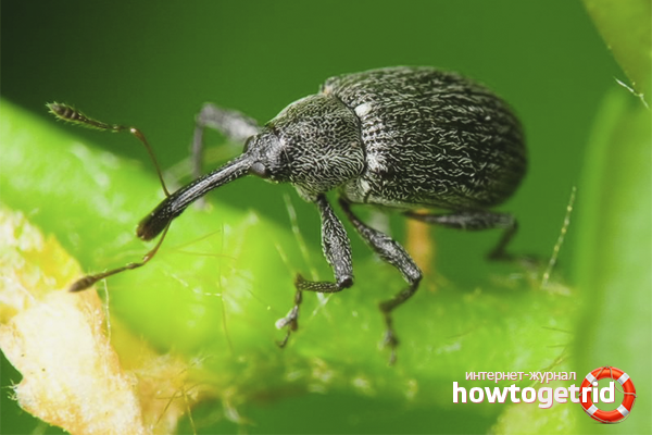 Weevils are beetles of all shades of black, brown and gray. The size of this insect is about three millimeters. Bugs live under large pieces of soil, where they winter. With the first rays of the spring sun, when the earth begins to warm up, the beetles crawl to the surface. They can be recognized by their long and elongated nose, thanks to which the insect got its name.