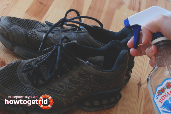 - The simplest, most affordable and effective drug is hydrogen peroxide. Pour liquid into an empty spray bottle and generously clean the inside. After a day, the smell disappears completely and does not resume within 2-3 weeks. Ideal for sports shoes. The disadvantage of this procedure is whitish stains on the fabric texture.