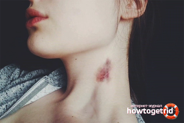 Suction occurs as a result of damage to the capillaries and blood vessels caused by increased pressure due to absorption by the lips of the skin area. Suction is a particularly passionate kiss, after which hematomas and focal spots formed as a result of bursting of blood vessels remain on the skin. Outwardly, the suction is similar to a bruise, but they have reddish-brown blotches in a dark pink halo.