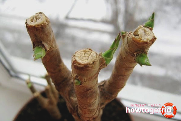 Removed dracaena parts do not have to be thrown away. Preparations can be sprouted in a glass of warm water or a container with sphagnum. Sprouts that have acquired their own roots are planted in the pot in which the mother stem lives, or a new small pot.