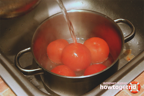 Place the washed and notched tomatoes in the sink. Pour boiling water from the kettle. Water each tomato for at least 10 seconds. Usually this is enough for the skin to begin to depart on its own. If some tomato still resists and does not want to undress, pour boiling water over it again.