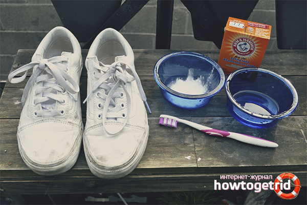 - If it is necessary to clear the yellowness of the inner section of the sneakers, by analogy, you can use a paste or tooth powder. In this case, it is more logical to distribute the composition from two sides, then leave for 30-40 minutes and proceed to rinse.