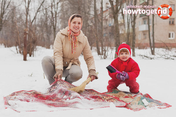 After this, the carpet should be hung on the crossbar and carefully knock out the remaining snow with pollution.