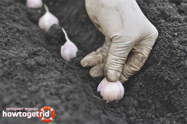 5 cm in each groove are loosened and large cloves of garlic are laid one at a time with a distance of 15 cm. After that, it is sprinkled with earth, in which elements of mulch may be present, and left for the winter.