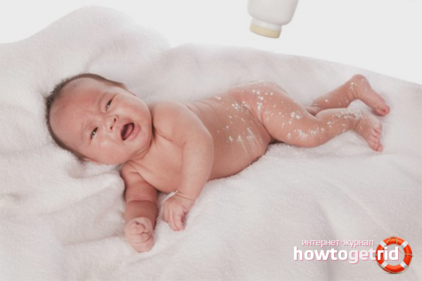 - The powder must first be applied to the hands, and then gently rub the talcum powder over the skin of the baby so that there are no lumps. Too much powder is not needed. Talc, which will show off on the surface of the diaper, will reduce its ability to absorb liquid. This leads to the fact that the baby will be wet. A thin layer is enough.