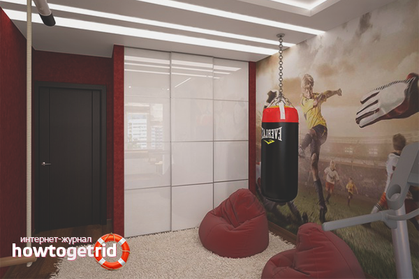 It is possible to equip a sports wall in the children's bedroom with a horizontal bar, stairs, gymnastic rings and a punching bag.Such a complex will contribute to the comprehensive physical development of the child, as well as direct the indefatigable energy of the child in the right direction.