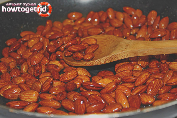 To fry the almonds for subsequent cooking, it is simply dried in the oven or in a dry frying pan for 10-15 minutes, stirring constantly. It is better to calcinate the almonds in small portions, evenly distributing them on the leaf and turning from side to side so that it does not burn and cook completely. When the kernels got dark and a rich nutty smell started to go - it's time to remove the kernels. Do not bring the nuts to a copper-brown shade, prolonged roasting deprives the nut of a pleasant taste and beneficial properties.