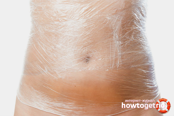 - The mass is distributed over the problem areas of the skin with a thick layer. Then you can turn around the film. Do 4-5 turns, do not overtighten polyethylene, so as not to slow down blood circulation.