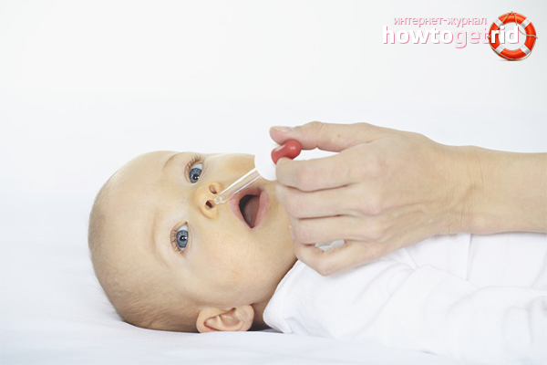 Tilt the crumb head a little back and drip 2 drops of the product into each nostril in turn. When you process the right nostril, then turn the head to the left, while the left - on the contrary. It happens that a particle of drops gets into the baby’s mouth, which causes an unpleasant sensation and crying. But you do not need to pay attention to this, continuing the procedure. Remember that you can not drip a lot of drops, as they can get into the ear canal and lead to otitis media. Also, do not try to soften the crust with a pear, a pipette is quite enough for the baby.