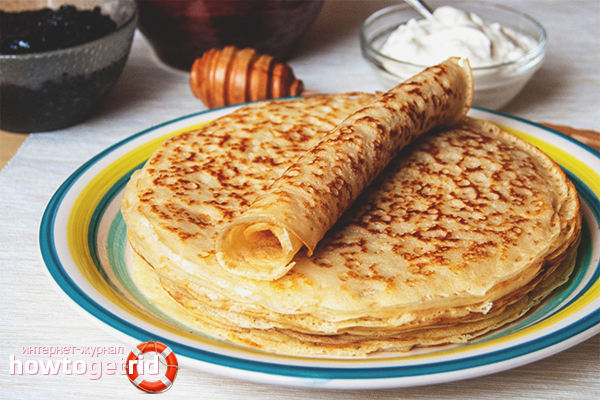 - Heat the pan, pour a little vegetable oil. It is better to lubricate the brush in it and apply the composition to the working coating. Scoop out half the dough cooker, pour in the middle and stretch. Bake pancakes on each side for 3-5 minutes.