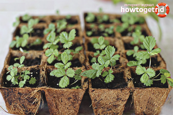 Seedlings with 2 real leaves are dived into separate pots. Every 2 weeks fertilizers for strawberries are applied to the soil. Grown and matured bushes are planted in open ground in spring or autumn.