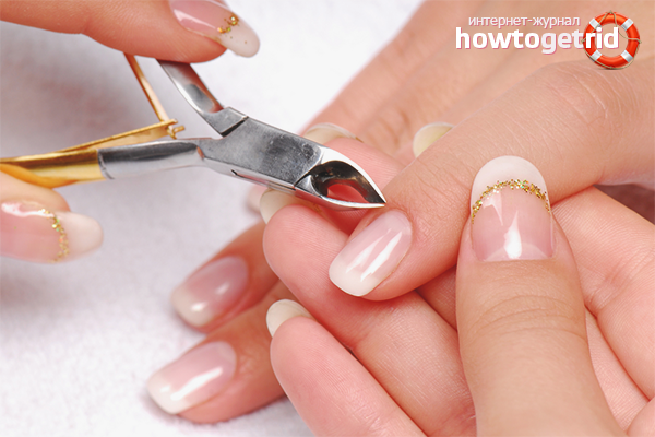 - Grab one finger with the other hand, pull the cuticle to protrude the edge.Take manicure forceps and cut the cuticle first from one side, moving to the middle, then from the second. You can not cut it in one direction, otherwise you will touch live sections with the other side of the forceps.
