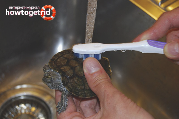 To bathe the turtles, you need to prepare a container with warm water. The room where hygienic baths are carried out should also be sufficiently warmed up and without drafts. Water should be poured into the bath up to two-thirds of the turtle's growth. For washing, you can use a soft sponge, and if the pet is too dirty, then the baby soap will not be harmful.
