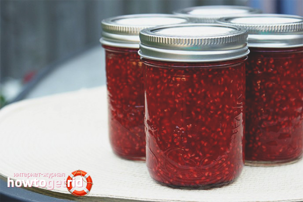 - When you cook the mixture for the third time, the jam will change its color, and the berries will completely dissolve (only the grains will remain). Since winter raspberry jam closes during the hot cycle, carry out manipulations immediately after removing the product from the heat.