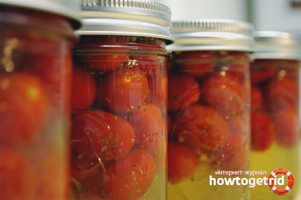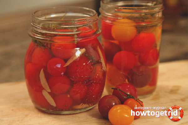 - Pour the solution into a jar of cherry tomatoes, roll up the tin lids. Turn the containers upside down, place a towel, leave for 3-4 hours until completely cooled. Then take the cans to a dark room. After 4 weeks, tomatoes can be served.