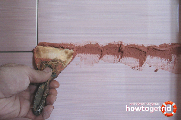 The seams on the wall are overwritten after 7 days, when the tile adhesive has finally hardened. The gaps between the tiles are wetted with water before work. The liquid is applied with a thin brush. Moisture provides adhesion of the grout to the base.