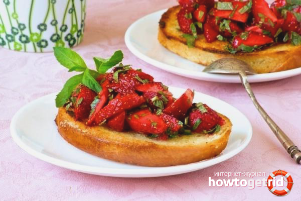 - Prepare a container for baking food in the oven. Put in it already fried croutons, top with strawberry sauce. Send the form to the oven for 5-7 minutes, cook at 160 degrees. Cool before serving.