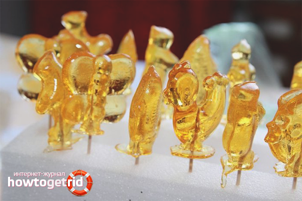 - After this, it remains only to pour the syrup into the molds and wait until it completely hardens. As is the case with sugar candies, after the formation of a viscous mass, insert toothpicks for easy extraction.