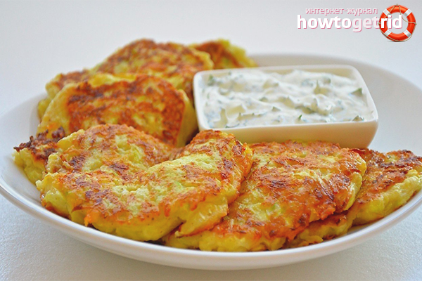Buy young zucchini to make pancakes. If you need to prepare a dietary dish without oil, select the recipe you like, prepare the dough and pour it into forms. Bake at 180 degrees for a quarter hour. Serve zucchini cakes with mayonnaise and garlic sauce, yogurt or sour cream, ketchup, cream cheese.
