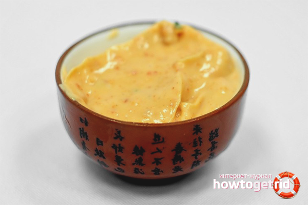 - Combine mayonnaise and soy sauce in one mass, add the previously obtained chili-based pasta. Beat the composition with two forks or a whisk, add flying fish caviar.