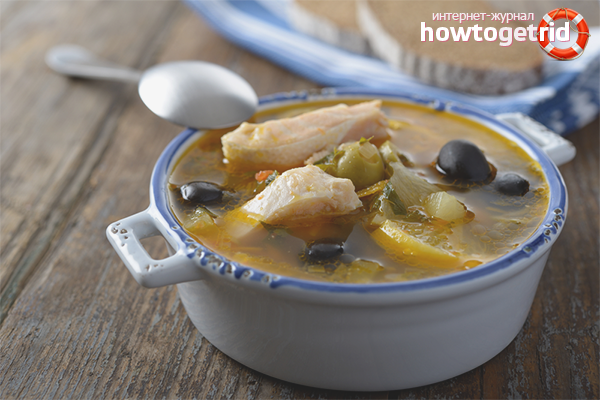 - Simmer the soup between medium and low for a quarter of an hour. 5 minutes before the end of the process, enter olives or olives, divided into 2 halves. When serving, sprinkle with chopped dill and a slice of lemon.