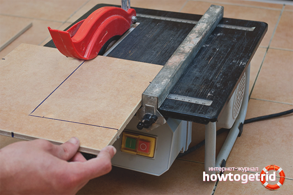 The tile is held with two hands and slowly moved to the included tool. The circular saw works slower than the grinder, but thanks to the adaptation, the slices are even and smooth, do not need to be ground.