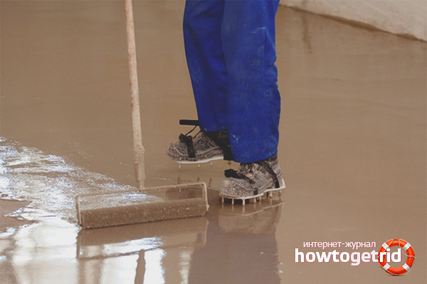 Next, using a spatula, the mixture should be evenly distributed throughout the room. By the way, the future floor should be poured near the far wall from the door. Also do not forget about studded tips for your shoes. If this is your first time encountering such an experience in repairing premises, it is best to take a notched trowel. With it, you can more evenly distribute the composition.