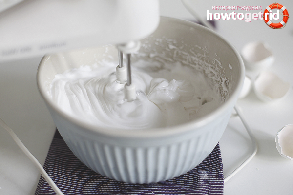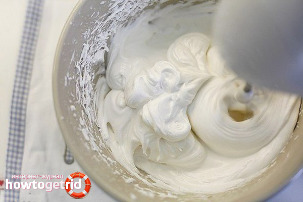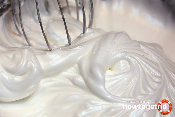 - In a dry fat-free container, carefully beat the chilled proteins to a thick foam. At the time of mixing the mass, add citric acid.