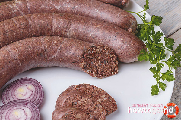 - Season the ingredients with your favorite seasonings to taste. Muscat, cloves, coriander perfectly enter the black pudding. Salt, pack over the intestines. Boil in boiling water for 45-60 minutes. If necessary, increase the duration of longing.
